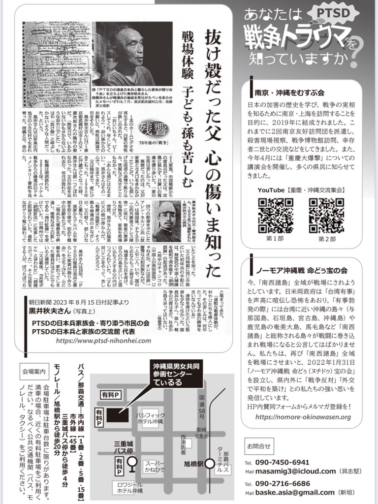 沖縄戦から80年となる。戦時中の過酷な体験がトラウマとなり引き起こされる戦争PTSD(心的外傷後ストレス障害)を考えるシンポジウムが8月3日、那覇市内で開かれる。沖縄戦の継承や中国・南京の人々との交流を通じて、戦後も当事者に深い傷を残し、世代を超えて影響を与える「戦争トラウマ」と向き合う2人のパネリストに寄稿してもらった。
