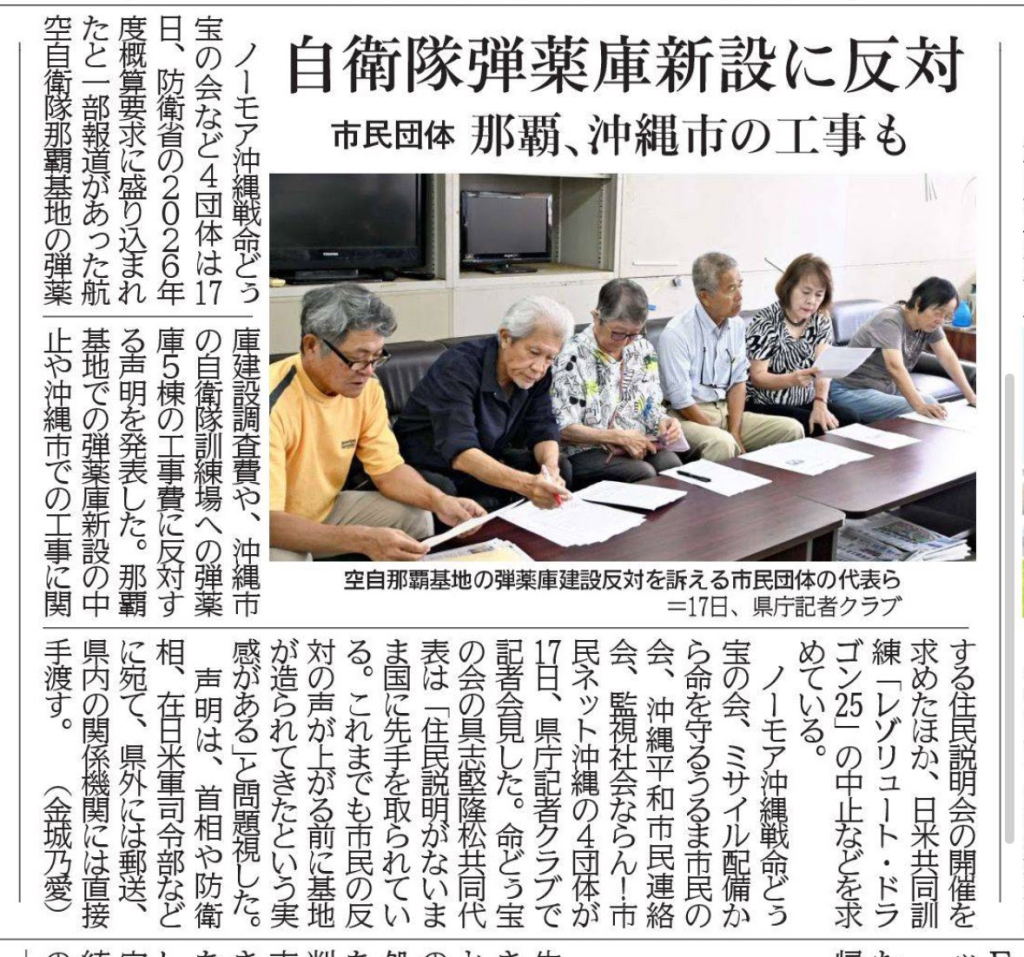 防衛省2026年度概算要求に航空自衛隊那覇基地への弾薬庫建設の調査費、沖縄市の自衛隊訓練場への弾薬庫5棟の建設工事費が計上されたと9月14日付しんぶん赤旗が報じた。報道では「那覇基地は那覇空港に隣接」し、「敵基地攻撃につながる長射程ミサイル」保管の可能性を指摘する。県都那覇市の住宅密集地、那覇空港に隣接する空自那覇基地への弾薬庫新設は県民の命と暮らしを脅かし、観光・交通・物流に重大な影響を及ぼすことが予想され、絶対に認められない。防衛省は沖縄市の弾薬庫5棟の着工に関する市民への説明会を一度も開いておらず、その内容は明らかにされていない。近接する米軍嘉手納弾薬庫の自衛隊共同使用を含め、断固拒否する。