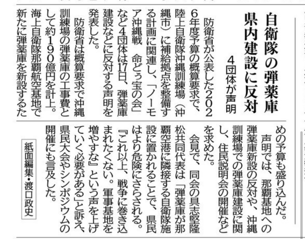 「空自那覇基地弾薬庫調査費、沖縄市自衛隊施設の弾薬庫5棟工事費計上に反対する声明」